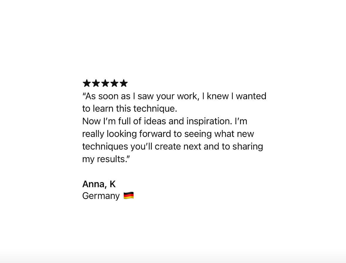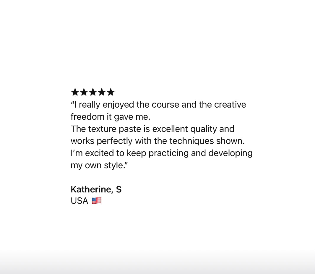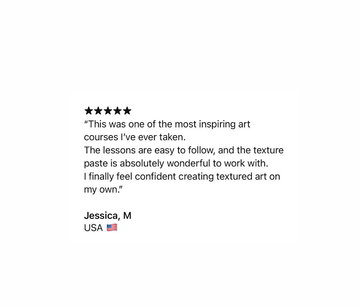 Absolutely! You get step-by-step video lessons, a full materials list, and my personal guidance, all designed to help you create real 3D textured art at home. Think of it as a complete art experience you can enjoy anytime — your investment in creativity and fun!